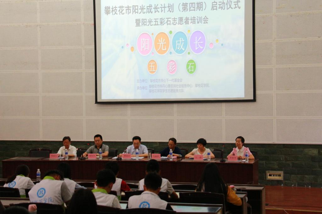 攀枝花市阳光成长计划(第四期)启动仪式暨阳光五彩石志愿者培训会于420日下午在攀枝花学院学术报告厅举行。攀枝花市关工委主任谢道全、市关工委副主任马丽萍、团市委副书记王莉、学生处负责人、校关工委常务副主任邓双全及100余名志愿者参加会议。