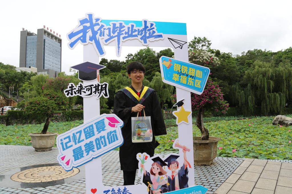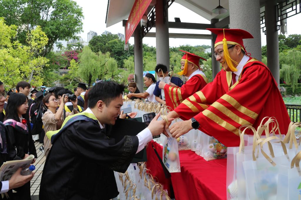 毕业典礼后,校领导们还在静明湖旁为毕业生们送上学校精心准备的毕业芒果礼。