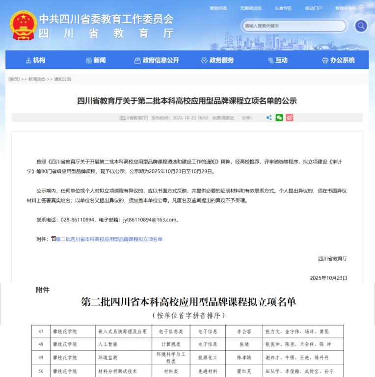 近日,四川省教育厅发布《关于第二批本科高校应用型品牌课程立项名单的公示》,我校《嵌入式系统原理及应用》《人工智能》《环境监测》《材料分析测试技术》四门课程,凭借鲜明的应用型特色与坚实的课程建设成功获批立项,学校立项数量位居全省同类高校前列。