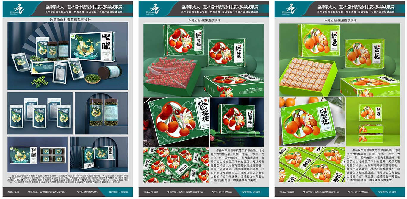 学院集中优势资源,打造了多个可复制、可推广的示范点。在米易县仙山村,围绕“水美乡村·云上仙山”定位,专家团队将服务升级为品牌系统整体构建,深入梳理该村文化脉络与产业特色。其中村史馆通过系统展陈呈现仙山历史变迁,留住乡愁记忆。这一模式,成功将仙山村从普通山村,提升为具有清晰品牌形象和美学气质的乡村旅游目的地,其《设计赋能农特产,品牌振兴乡村梦》项目成功入选《设计的力量—— 全国高校设计赋能乡村振兴创新案例》集。