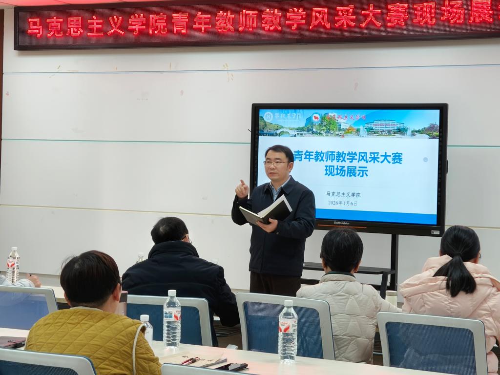 2026年1月6日,马克思主义学院青年教师教学风采大赛在学院会议室顺利举行。7位青年教师同台竞技,展示思政课教学实力,学院通过以赛促教的方式,为青年教师搭建交流提升平台。