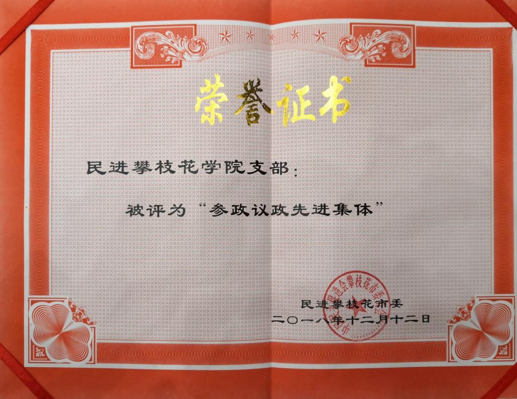 为鼓励和宣传民进基层组织参政议政优秀成果,激励广大民进会员更加积极主动投身参政议政工作。201812月,民进攀枝花市委开展了先进参政议政集体的表彰活动,我校民进支部被评为“参政议政先进集体”。